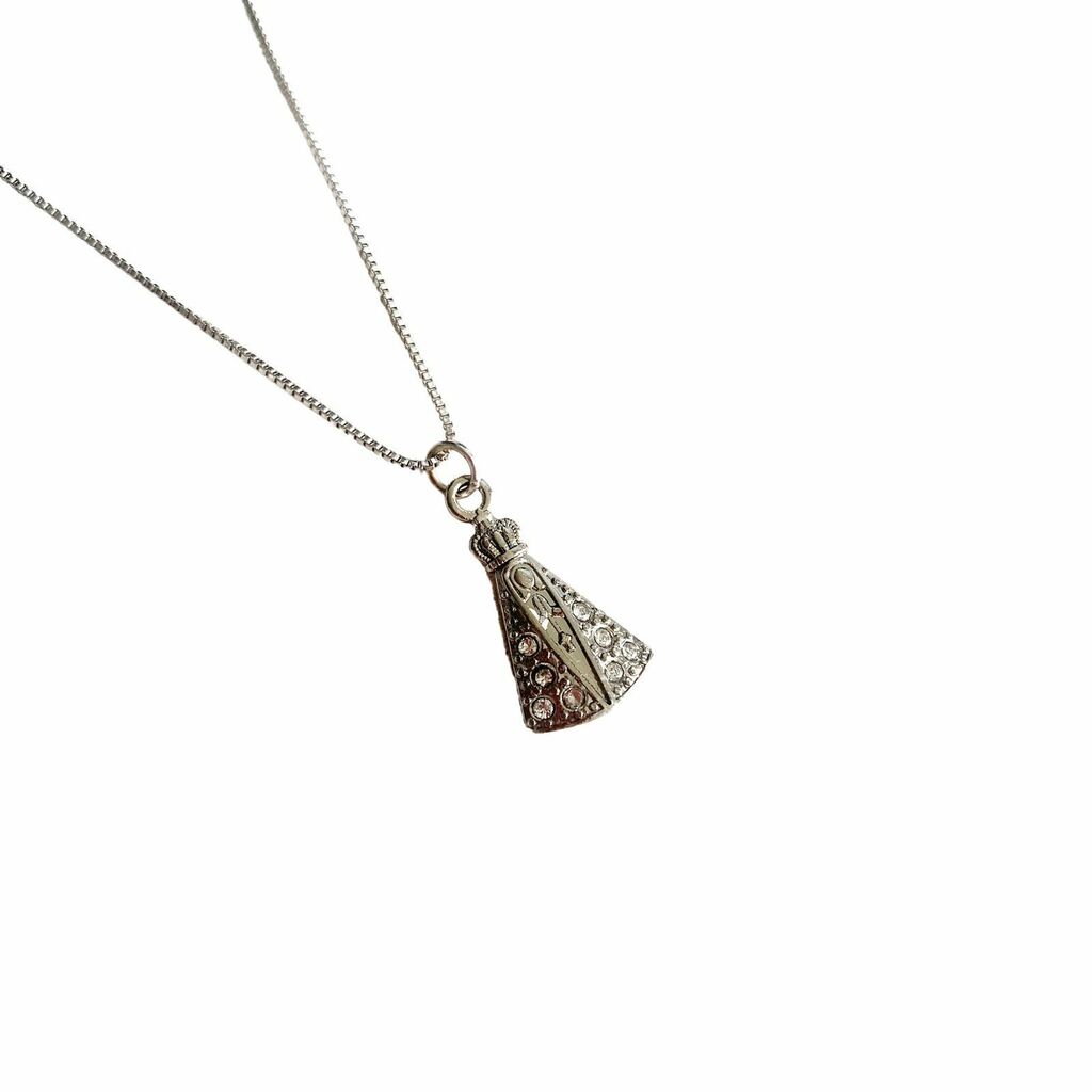 Colar com pingente de Nossa Senhora Aparecida , toda cravejada com strass, corrente tipo veneziana banhada a platina (metal nobre).