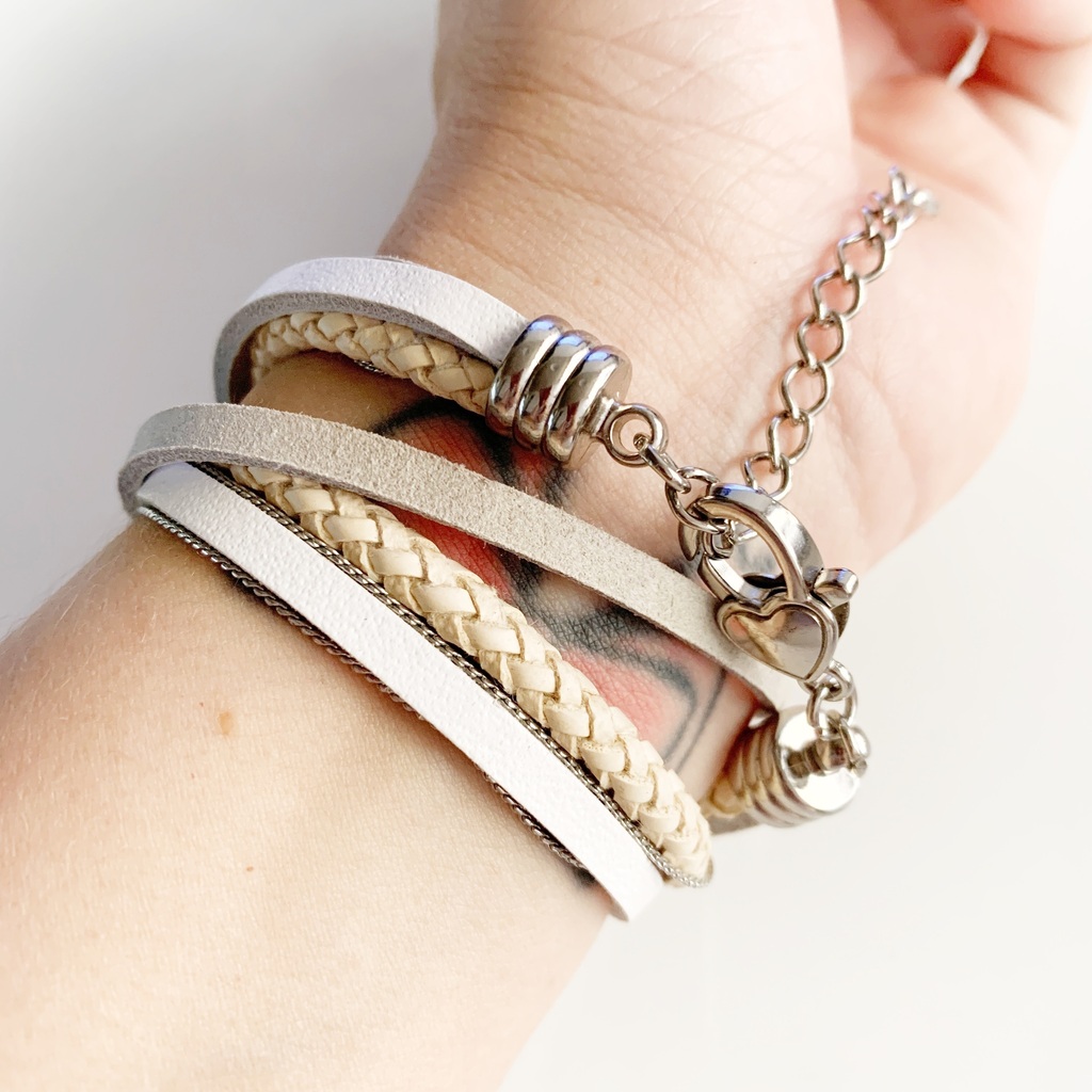 Pulseira feita com 3 tiras de couro diferentes, corrente, fecho mosquetão desenho de coração, pingente em forma de coração com simbolo do Autismo e corrente extensora banhadas a platina